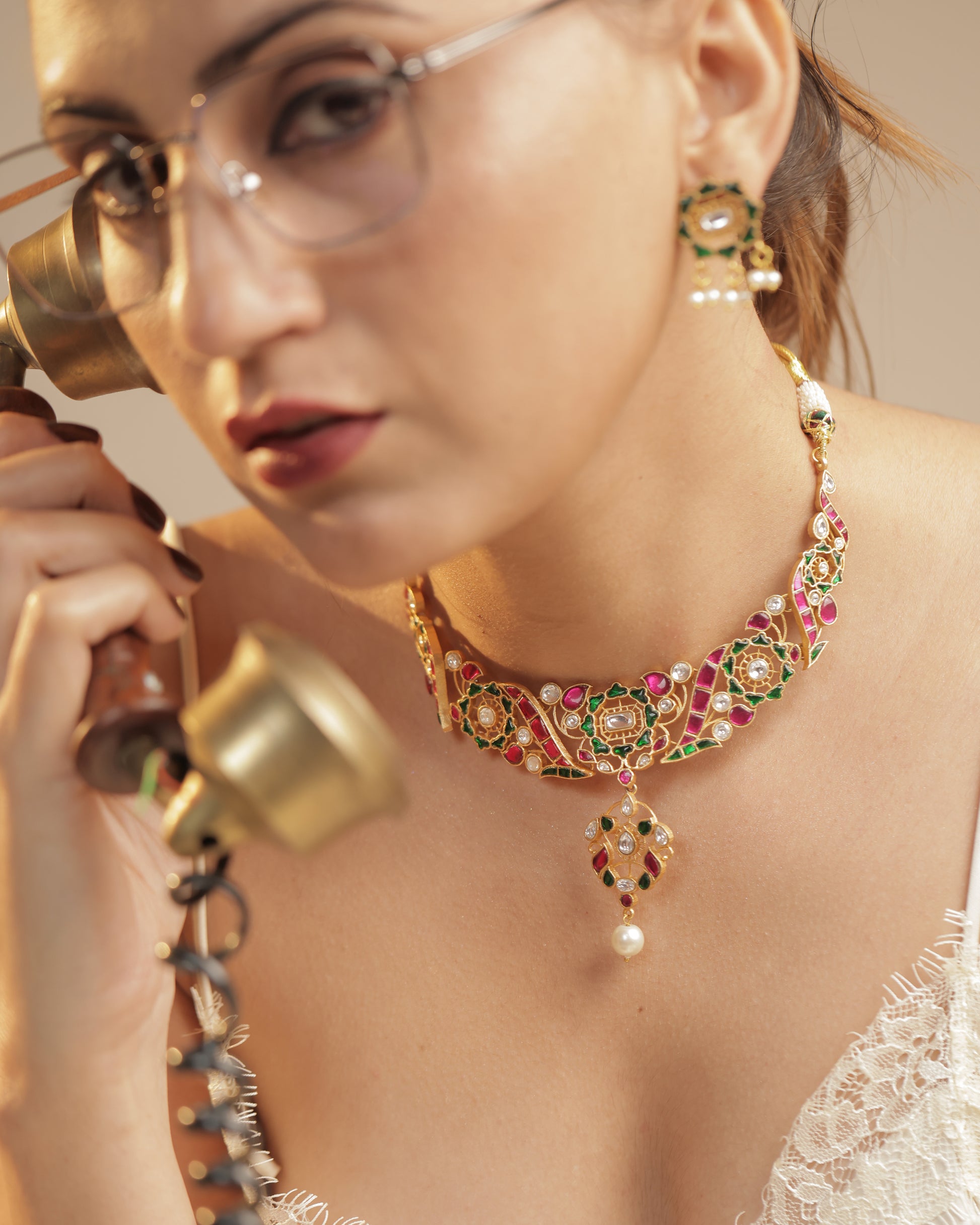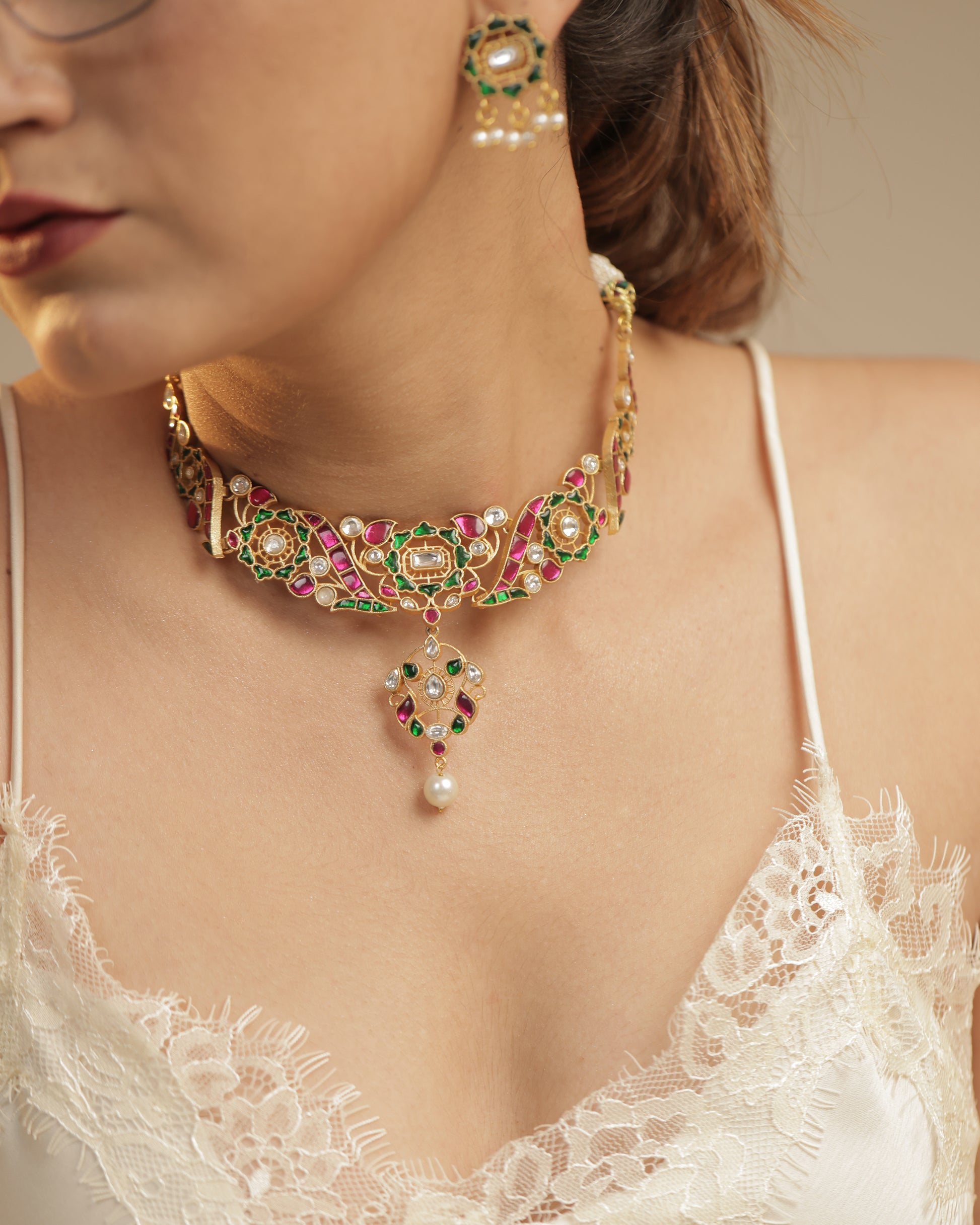 The Avira Set celebrates artistry and color in perfect harmony. Crafted with intricate enamel work in jewel tones of pink and green, highlighted by pearls and gold, this set radiates festivity and grandeur. A true statement piece, designed for the woman who carries tradition with modern grace.