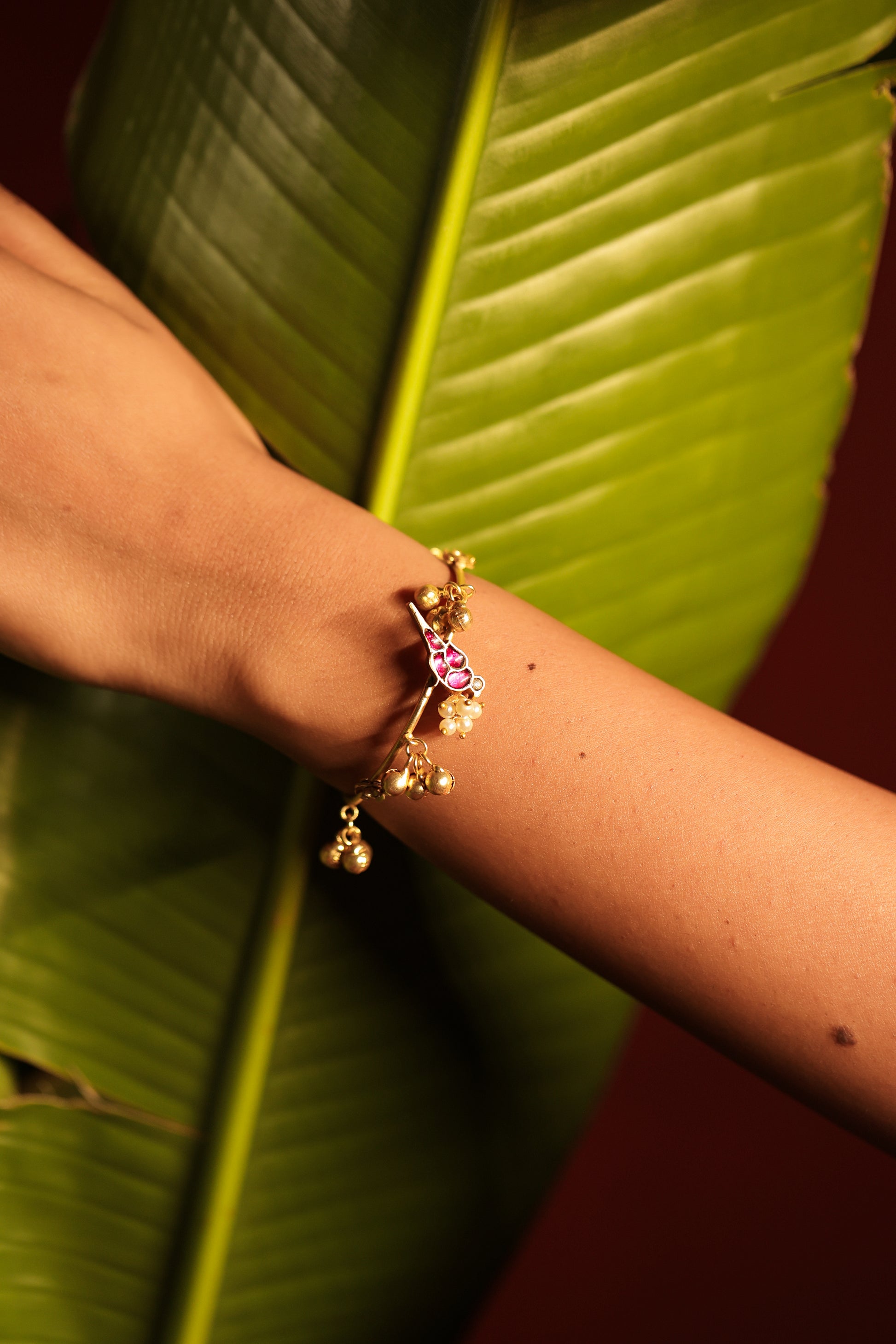 Celebrate the art of timeless elegance with the Parrot Amour Hand Bracelet. Adorned with an intricately designed parrot motif, delicate pearls, and golden ghungroo accents, this statement piece captures the essence of love and tradition in every detail. Perfect for weddings, festive occasions, or adding a regal charm to your look, Parrot Amour is where heritage meets modern sophistication.