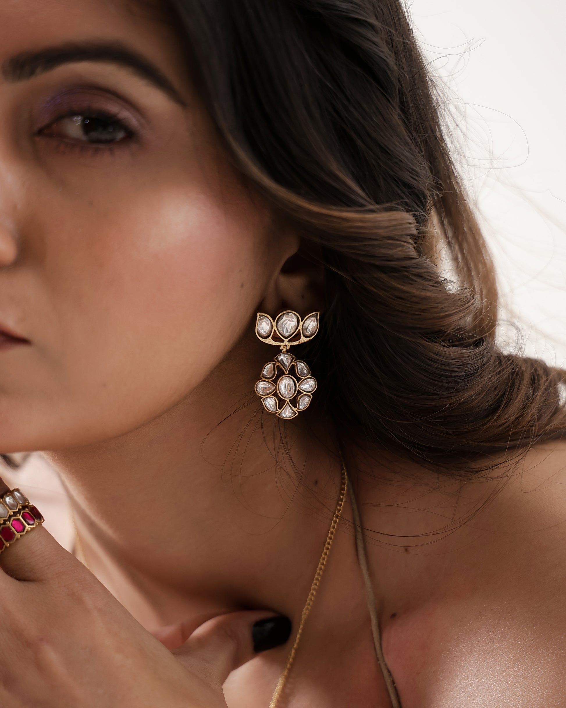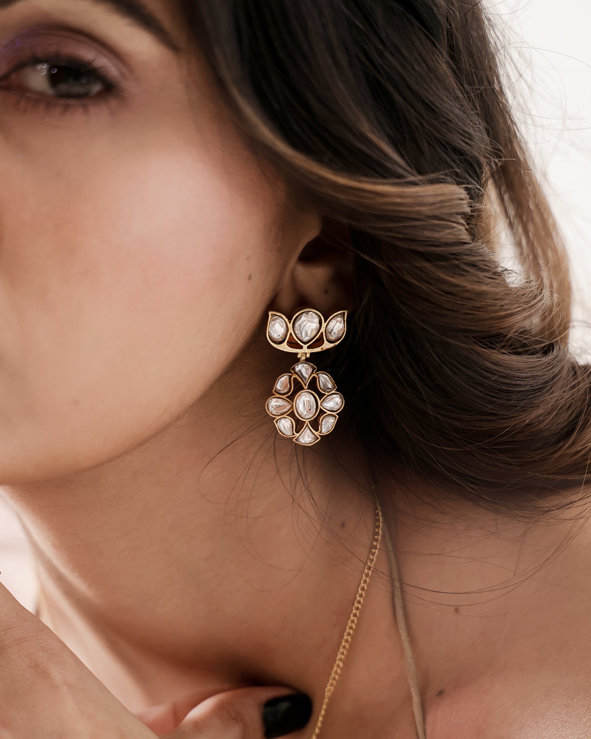 Delicately crafted with a floral polki design, these earrings embody soft elegance and timeless charm. Featuring a graceful drop silhouette with luminous stones set in a warm gold finish, they offer a refined statement without overpowering the look. Perfect for festive gatherings, weddings, and elegant day-to-evening styling, these earrings are designed to complement both traditional and contemporary ensembles.