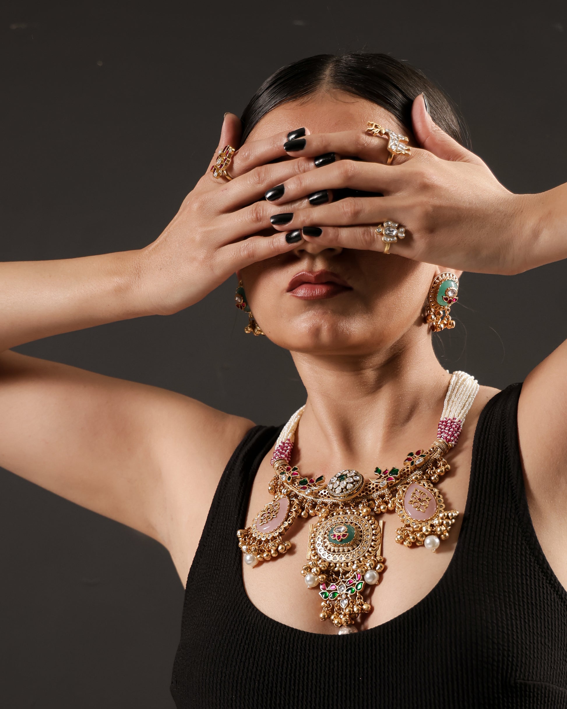 A bold celebration of heritage craftsmanship, this statement set features layered pearl strands adorned with intricate motifs and vibrant accents. Designed with an antique finish and detailed artistry, it reflects a regal, heirloom-inspired aesthetic. Perfect for festive occasions, cultural celebrations, and standout styling, this set is crafted for those who appreciate jewellery that tells a powerful story.