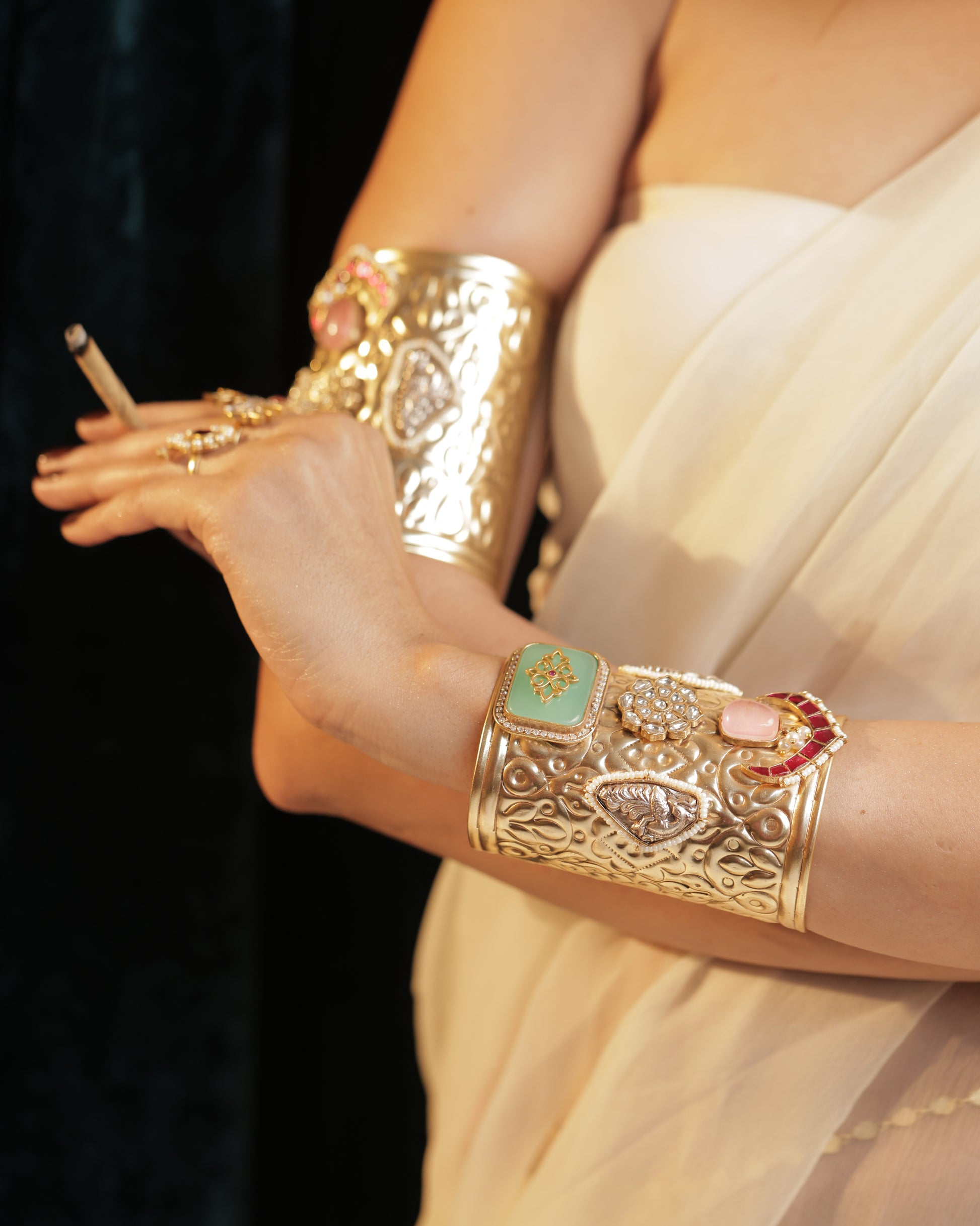 A symphony of grandeur and craftsmanship, the Noorhana Cuffs from ND Jewellers celebrate the beauty of heritage in a contemporary form. Embellished with Kundan and enamel detailing, each piece tells a story of regal artistry and bold expression. Designed for the woman who carries confidence like a crown, they’re more than adornments — they’re statements of strength and style.