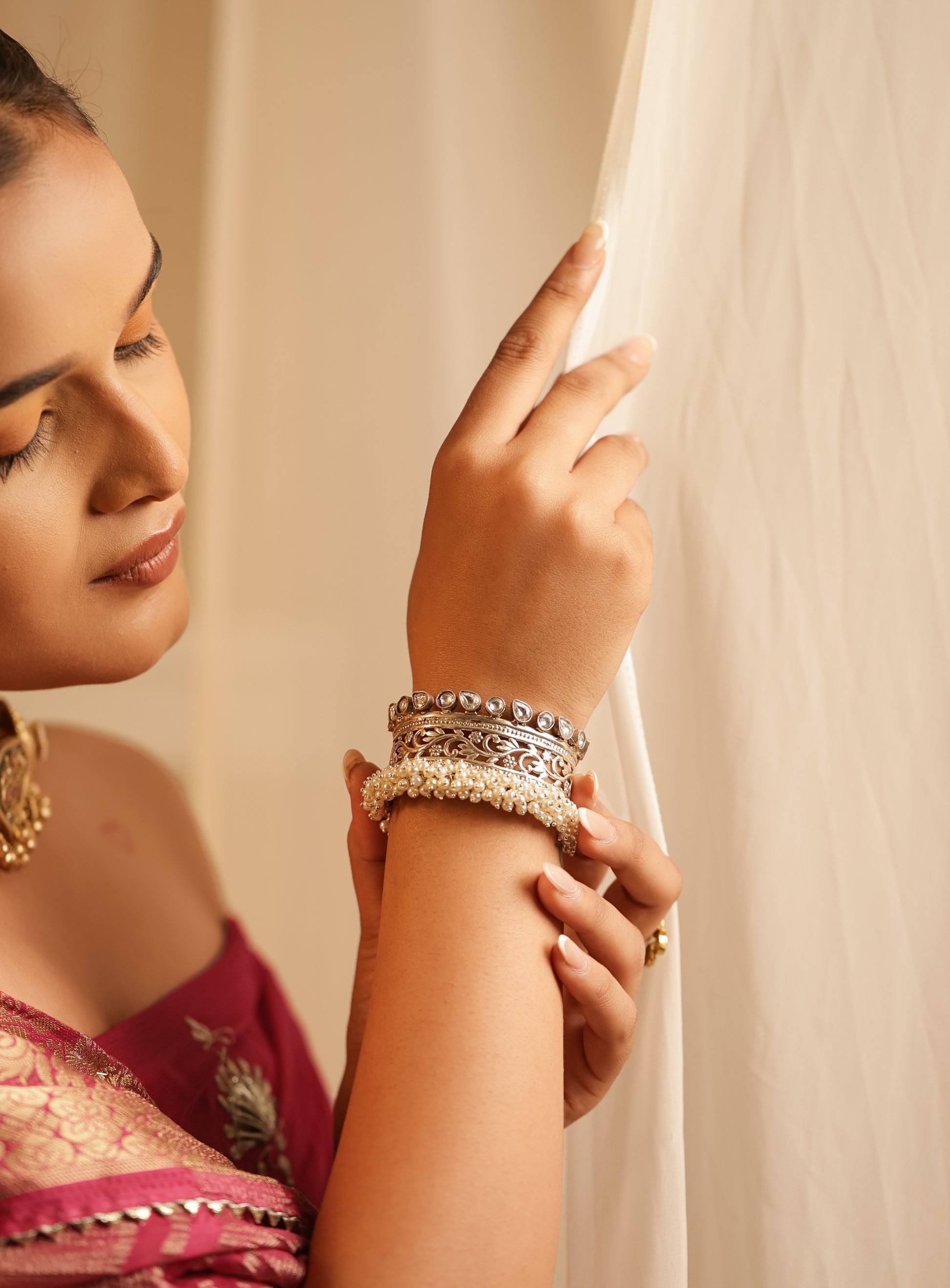 The Ranisa Bracelet (kada) from our tribal jewelry collection is handcrafted in brass. Intricate kundan work adds to the beauty of this Jaipuri boho bangle, making it a statement handpiece that compliments your ethnic as well as fusion outfits.