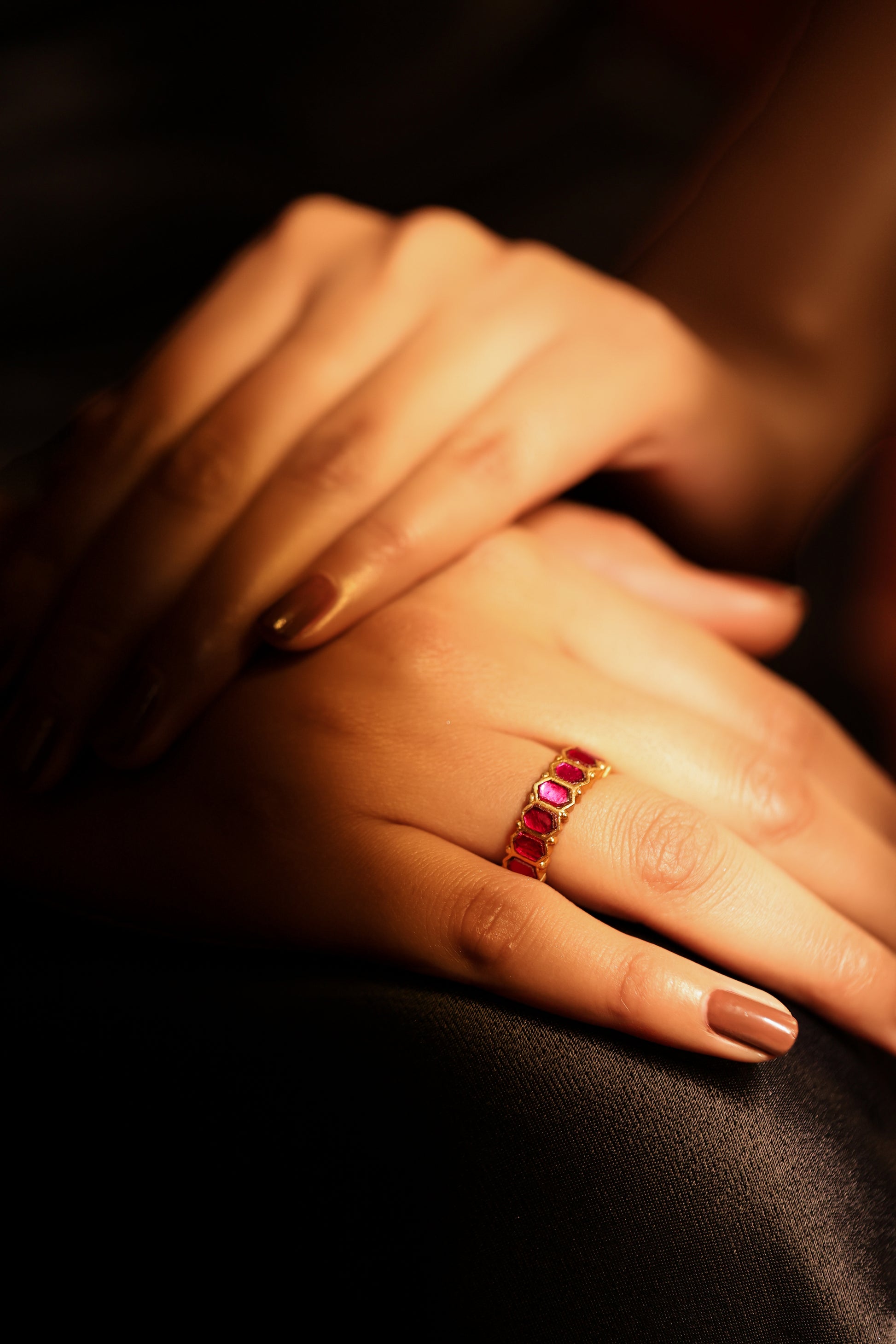 A timeless expression of elegance, the Ring showcases vibrant rubies set in intricate Kundan work. Effortlessly blending tradition with allure, it adds a regal charm to every look.